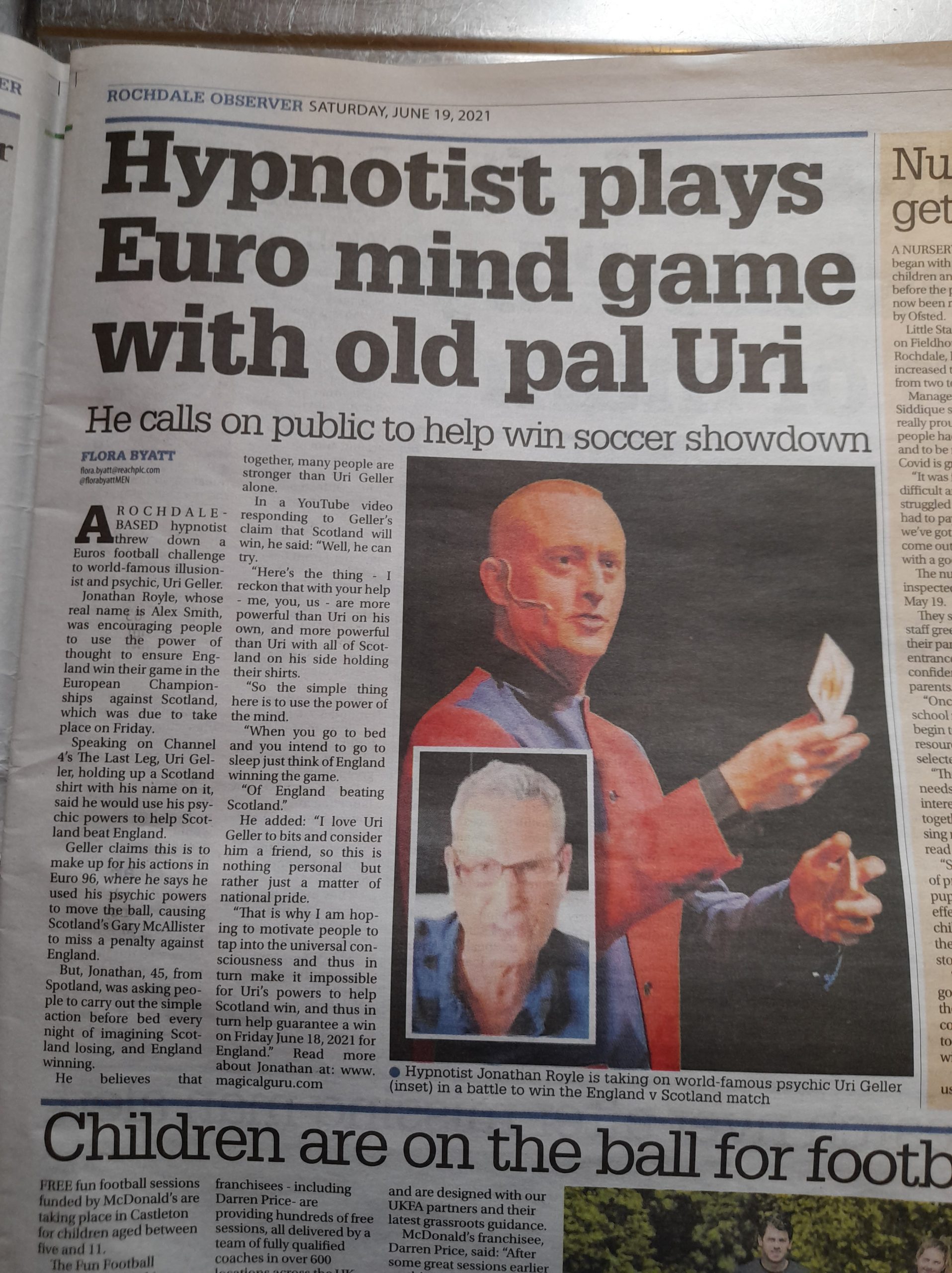 After helping England to Stop Uri Geller from using his mind powers to enable Scotland to win resulting in a 0-0 draw rather than the loss by England that Uri was hoping to gain by helping Scotland to win, Hypnotist Royle convinced Uri to join our side and channel his energies also into England winning the whole of Euro 2020.